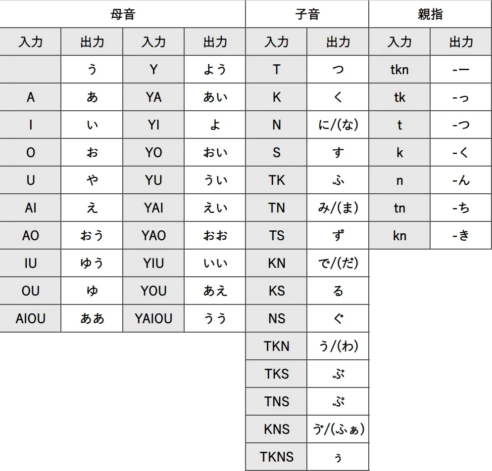実質的なキー数としては、本来3bitで住む母音+拗音を5bitで、親指3キーなので、